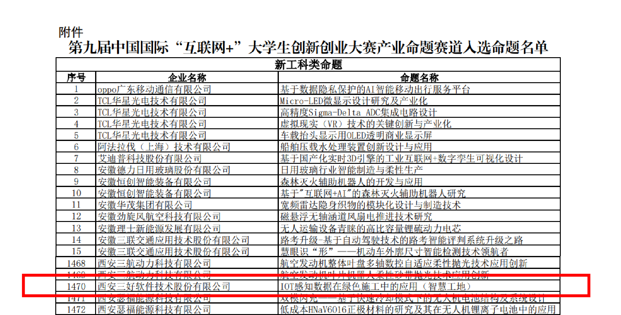 第九屆中國(guó)國(guó)際“互聯(lián)網(wǎng)+”大學(xué)生創(chuàng)新創(chuàng)業(yè)大賽產(chǎn)業(yè)命題賽道通知于6月28日正式發(fā)布!西安三好軟件技術(shù)股份有限公司《IOT感知數(shù)據(jù)在綠色施工中的應(yīng)用(智慧工地)》成功入選。作為國(guó)內(nèi)專業(yè)研究虛擬仿真技術(shù)集合互聯(lián)網(wǎng)理念在教學(xué)、培訓(xùn)、實(shí)訓(xùn)、項(xiàng)目管理中應(yīng)用的研究性軟件企業(yè),三好股份作為行業(yè)技術(shù)領(lǐng)先機(jī)構(gòu)和產(chǎn)品供應(yīng)商,致力于中國(guó)建設(shè)人才培養(yǎng)綜合服務(wù)。