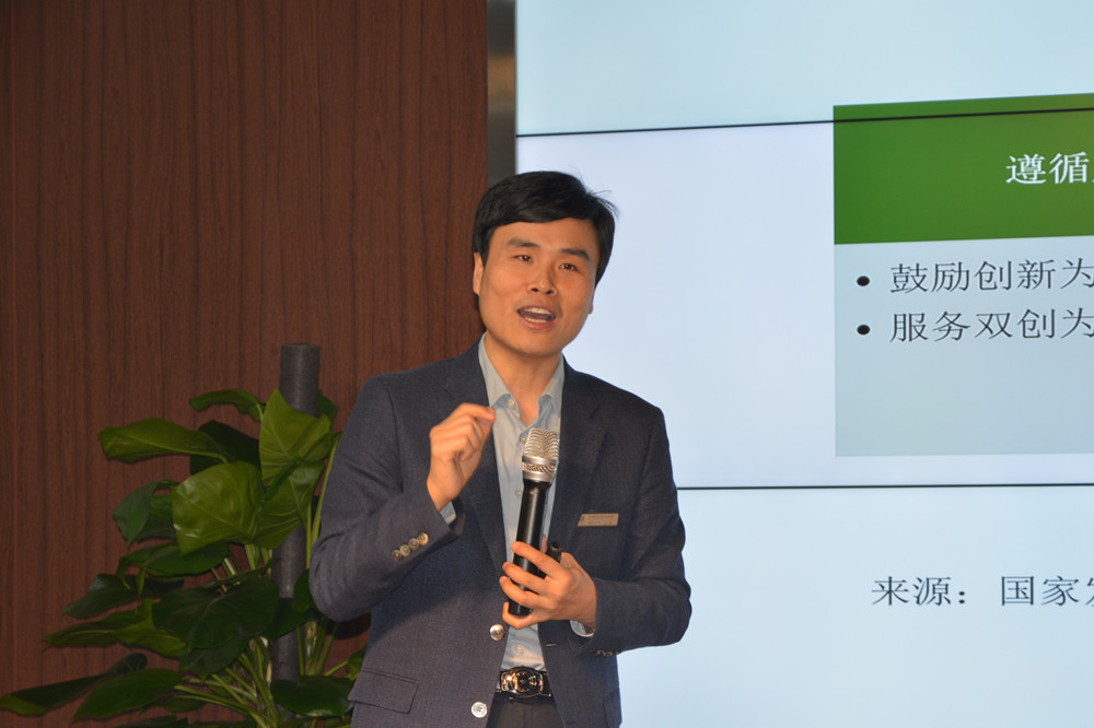 第二個分享的是雙創(chuàng)中心負責人研發(fā)中心創(chuàng)意部經(jīng)理項棟,分享主題《雙創(chuàng)職業(yè)技能培訓中心功能與產(chǎn)品介紹》。項經(jīng)理以雙創(chuàng)中心“締造者”的身份,對雙創(chuàng)中心的功能與定位、產(chǎn)品與價值、模式與創(chuàng)新進行了全面、深入的介紹,在整體認知上,對中午的參觀、體驗做了一個很好的補充,贏得了大家熱烈的掌聲。