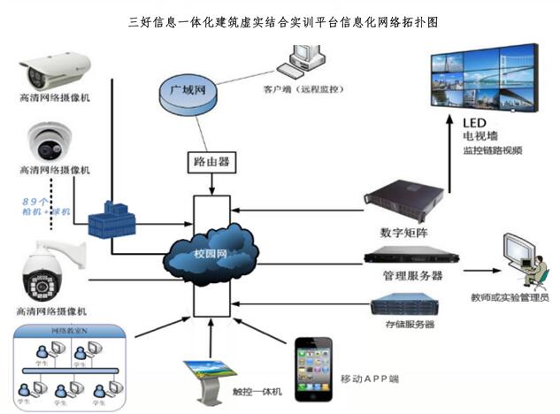 三好職業(yè)教育信息化綜合服務(wù)平臺以數(shù)字化的視頻壓縮、傳輸、存儲和播放為核心,通過設(shè)立中心平臺實現(xiàn)對系統(tǒng)內(nèi)所有教學(xué)設(shè)施展示區(qū)節(jié)點區(qū)視頻的集中管理與控制,用戶僅需通過IE瀏覽器登錄中心監(jiān)控平臺,即可實現(xiàn)全網(wǎng)中各個監(jiān)控點的控制和圖像的調(diào)用與瀏覽。平臺以網(wǎng)絡(luò)化傳輸、數(shù)字化處理為基礎(chǔ),以各類功能與應(yīng)用的整合與集成為核心,實現(xiàn)單純的圖像聯(lián)動、流媒體、圖像識別等應(yīng)用。高標(biāo)準(zhǔn)的信息一體化教學(xué)體系,讓三好英才學(xué)校在信息化、智慧化教學(xué)方面為樹立了行業(yè)標(biāo)桿。