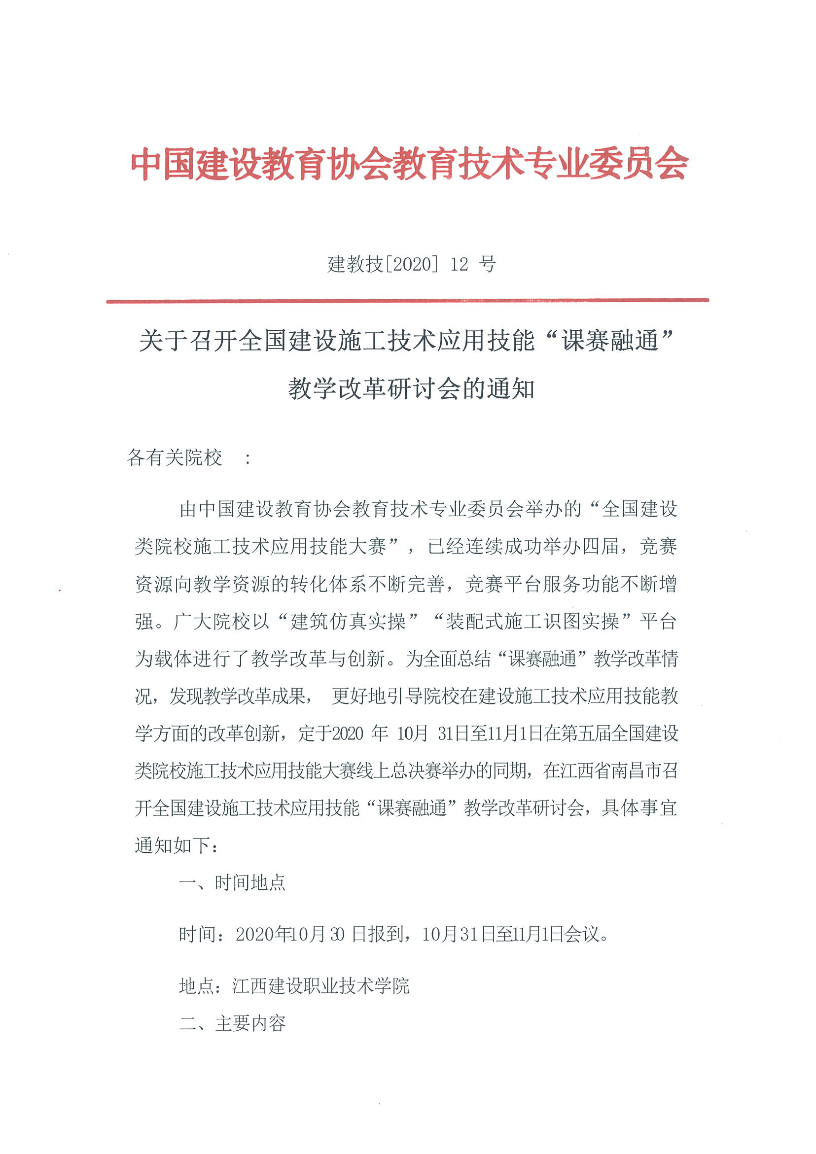 關(guān)于召開全國建設(shè)施工技術(shù)應(yīng)用技能“課賽融通”教學(xué)改革研討會的通知